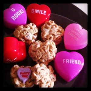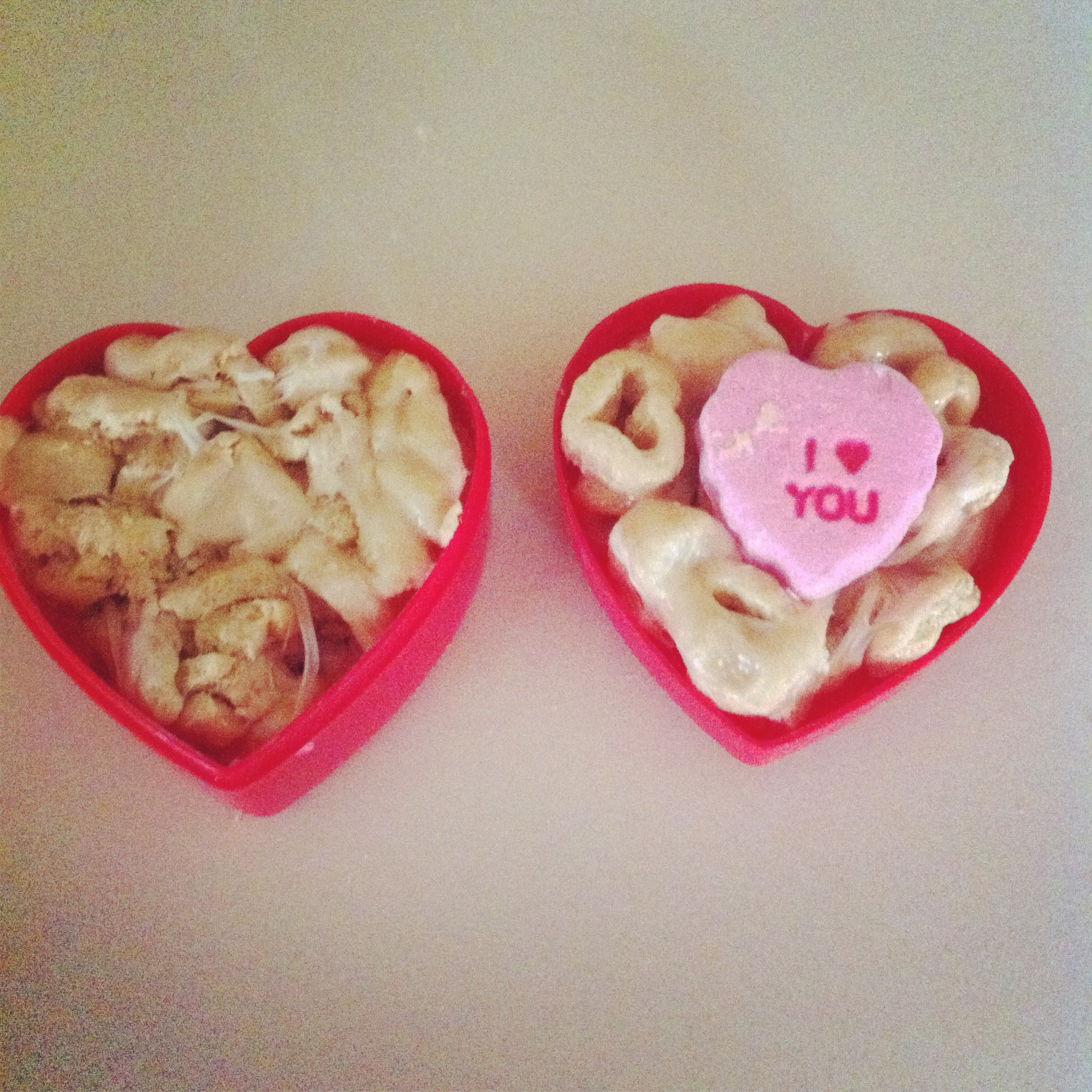 I did this easy Valentine Cereal Treat with my kids today. I was inspired by a similar version of this that I did at Easter last year. I cannot for the life of me remember where I got the original idea from, so I have no way of giving the appropriate person credit… so, so sorry.