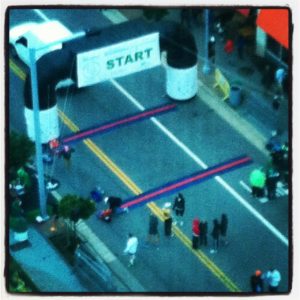 I woke up on race morning early with a migraine. I was annoyed, but have run many times in training with a migraine, so although not ideal, I would manage. I went to Alison’s hotel room before the race and as I sat and looked out her window at the start line (yes, this is an actual picture of me looking out her window).