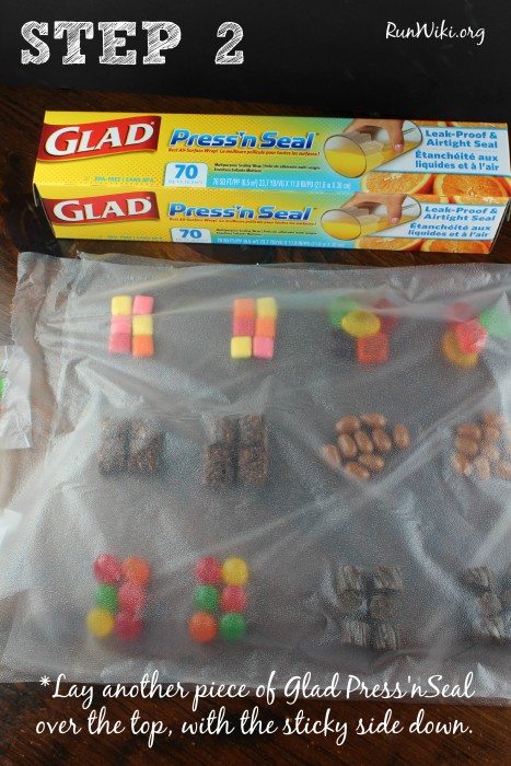Lay down a piece of Glad Press’n Seal sticky side up and measure out candy in 100-200 calorie piles.